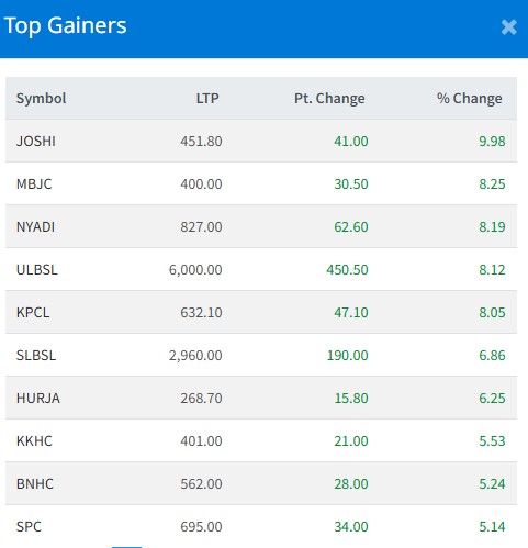 आज सबैभन्दा धेरै जोशी हाइड्रोपावर कम्पनीका लगानीकर्ताले कमाएका छन् । आज यस कम्पनीका लगानीकर्ताले ९ दशलमव ९८ प्रतिशतका दरले कमाएका छन् । सामुदायिक लघुवित्तका लगानीकर्ताले ८ लदशमलव ३० प्रतिशतका दरले कमाएका छन् । मध्य भोटेकोशीका लगानीकर्ताले ८ दशलमव २५ प्रतिशतका दरले कमाएका छन् ।