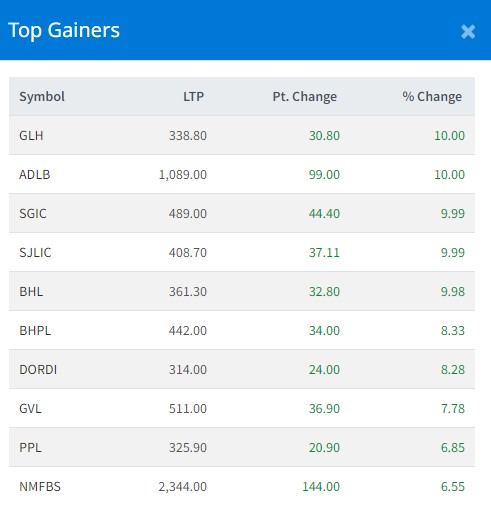 आज सबैभन्दा धेरै ग्रिन लाइफ हाइड्रोपावर कम्पनी र आदर्श लघुवित्त वित्तीय संस्थाका लगानीकर्ताले कमाएका छन् । यी कम्पनीका लगानीकर्ताले १० प्रतिशतका दरले कमाएका हुन् । सानिमा जिआइसी कम्पनीका लगानीकर्ताले ९ दशमलव ९९ प्रतिशतका दरले कमाएका छन् । सूर्याज्योति लाइफका लगानीकर्ताले पनि ९ दशमलव ९९ प्रतिशतका दरले कमाएका छन् ।