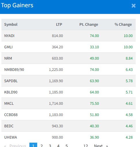 आज सबैभन्दा धेरै न्यादी हाइड्रोपावर कम्पनी र गार्डियन माइक्रो फाइफ इन्स्योरेन्सका लगानीकर्ताले कमाएका छन् । आज यी २ कम्पनीका लगानीकर्ताले १० प्रतिशतका दरले कमाएका हुन् । नेपाल रिपब्लिक मिडियाका लगानीकर्ताले ८ दशलमव ८४ प्रतिशतका दरले कमाएका छन् ।