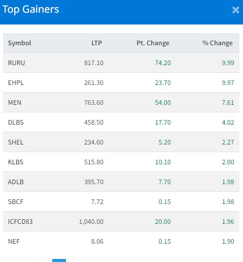 आज सबैभन्दा धेरै रुरु जलविद्युत कम्पनीका लगानीकर्ताले कमाएका छन् । कम्पनीका लगानीकर्ताले ९ दशमलव ९९ प्रतिशतका दरले कमाएका छन् । इष्र्टन हाइड्रोपावर कम्पनीका लगानीकर्ताले ९ दशमलव ९७ प्रतिशतका दरले कमाएका छन् । माउन्टेन इनर्जी कम्पनीका लगानकिर्ताले ७ दशमलव ६१ प्रतिशतले कमाएका छन् ।