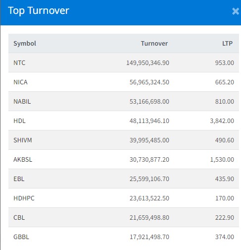 त्यस्तै, एनआइसी एशिया बैंकको ५ करोड ६९ लाख रुपैयाँको शेयर कारोबार भएको छ । नविल बैंकको ५ करोड ३१ लाख रुपेयाँको शेयर कारोबार भएको छ । हिमालयन डिष्टिलरीको ४ करोड ८१ लाख रुपैयाँको शेयर कारोबार भएको छ ।