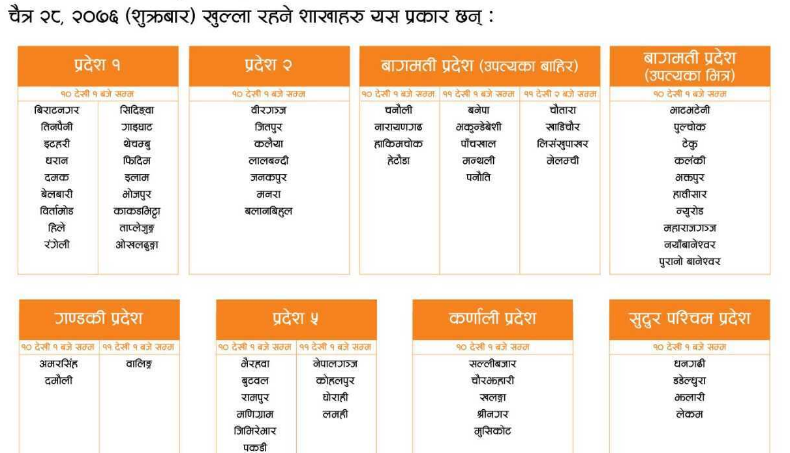 उक्त शाखाहरु ११ बजेदेखि १ बजेसम्म खुल्ने बताइएको छ । साथै, बैंकले डिजिटल बैंकिङ कारोबार गर्न समेत