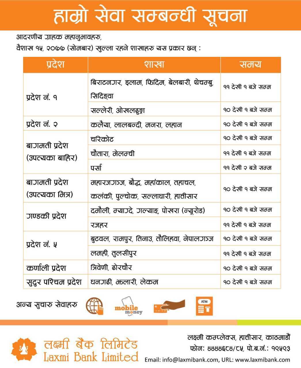 काठमाडौं । लक्ष्मी बैंकले आज उपत्यकाभित्र तथा उपत्यका बाहिरका विभिन्न शाखा कार्यालयबाट सेवा दिने भएको छ । बैंक विहान ११ बजेदेखि दिउँसो १ बजेसम्मका लागि खुल्ला हुने जानकारी गराइएको छ ।