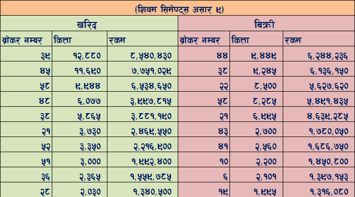 आज शिवम सिमेण्ट्सको सर्वाधिक ५ करोड १८ लाख बराबरको शेयर किनबेच भएको छ। कम्पनीको बजार मूल्य १ दशमलव ३८ प्रतिशतले वृद्धि हुँदै ६६० प्रति कित्तामा बजार बन्द भएको छ।