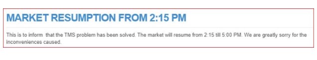 उक्त समस्या समाधान भएकाले फेरि कारोबार सुरु गरिएको नेप्सेको भनाई छ । २ः १५ बाट बजार पुनः खुलेको हो । आज नेप्से साँझ ५ बजेसम्म खुल्ने नेप्सेले जनाएको छ।