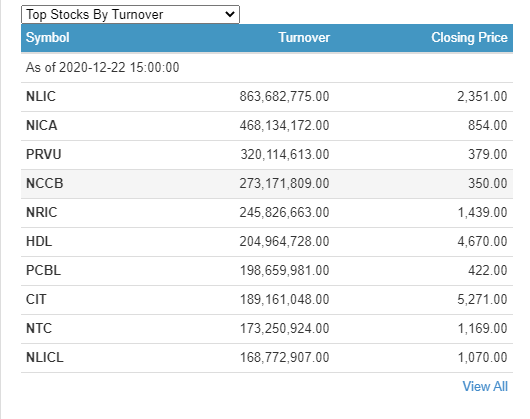 आज सबैभन्दा धेरै नेपाल लाइफको ८६ करोड ३६ लाख रुपैयाँको कारोबार भएको छ । एनआइसी एशियाको ४६ करोडमाथिको करोबार भएको छ । प्रभु बैंकको ३२ करोडमाथिको कारोबार भएको छ । एनसीसी बैंकको २७ करोडमाथिको कारोबार भएको छ । नेपाल पुनर्बीमा कम्पनीको २४ करोडमाथिको कारोबार भएको छ ।