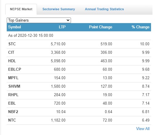 आज हिमालयन डिष्टिलरी लिमिटेड, साल्ट ट्रेडिङ्ग कर्पोरेशन लिमिटेड, नागरिक लगानी कोष, एभरेष्ट बैंक लिमिटेडको अग्राधिकार शेयर, मल्टीपर्पस फाइनान्स कम्पनी लिमिटेड, शिवम् सिमेन्ट, रसुवागढी हाइड्रोपावर कम्पनी लिमिटेड, एभरेष्ट बैंक लिमिटेड, नबिल ब्यालेन्स फण्ड २ र नेपाल टेलिकमका शेयरधनीहरूले सबैभन्दा धेरै आम्दानी गरेका छन् ।