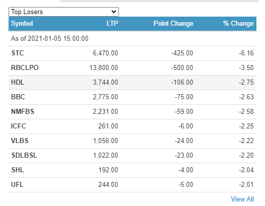 त्यसैगरी आज सबैभन्दा धेरै साल्ट ट्रेडिङका लगानीकर्ता ६ प्रतिशतभन्दा बढीका दरले गुमाएका छन् । हिमालयन डिस्टीलरी, विशाल बजार, विजय लघुवित्त, युनाइटेड फाइनान्स, सोल्टी होटल्स लगायतका लगानीकर्ताले गुमाएका छन् ।