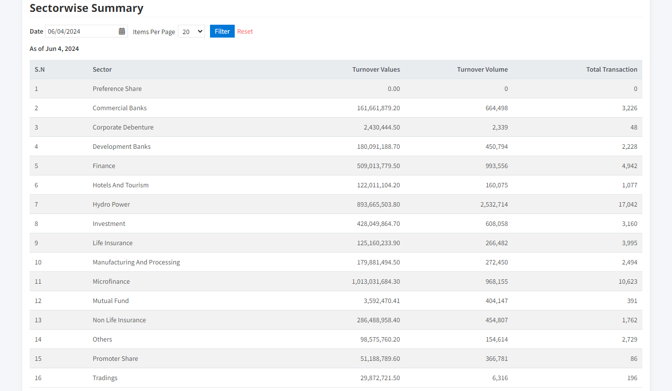 काठमाडौं । ९१ सूचीकृत कम्पनी सहित हाइड्रोपावर सेक्टर नेप्सेमा संख्याको हिसाबमा सबै भन्दा ठूलो सेक्टर हो । त्यसको परिणाम स्वरुप सर्वाधिक रकमको कारोबार यस क्षेत्रको हुँदै आएकोमा आज लघुवित्त सेक्टरको सर्वाधिक कारोबार भएको छ । लघुवित्त सेक्टरको आज १ अर्ब १ करोडको कारोबार भएको छ भने दोश्रोमा हाइड्रोपावर सेक्टरको ८९ करोड ३६ लाखको कारोबार भएको छ । आज नेप्सेमा ४ अर्ब ४ करोडको कारोबार भएको थियो ।