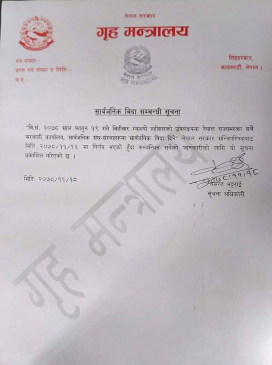 गृह मन्त्रालयका अनुसार फागुन १९ गते बिहीबार ग्याल्पो ल्होसारको उपलक्ष्यमा नेपाल राज्यभरका सबै सरकारी कार्यालय, सार्वजनिक संघस्थाहरूमा सार्वजनिक विदा दिने निर्णय गरेको जनाएको छ ।