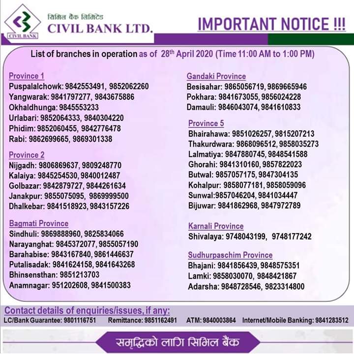 बैंकले सातै वटा प्रदेशका विभिन्न शाखा कार्यालय मार्फत आफ्ना ग्राहकहरुलाई बैंकिङ सेवा दिने जनाइएको छ । साथै, बैंकले डिजिटल बैंकिङ कारोबार गर्न समेत बैंकले ग्राहकहरुलाई आग्रह गरेको छ ।