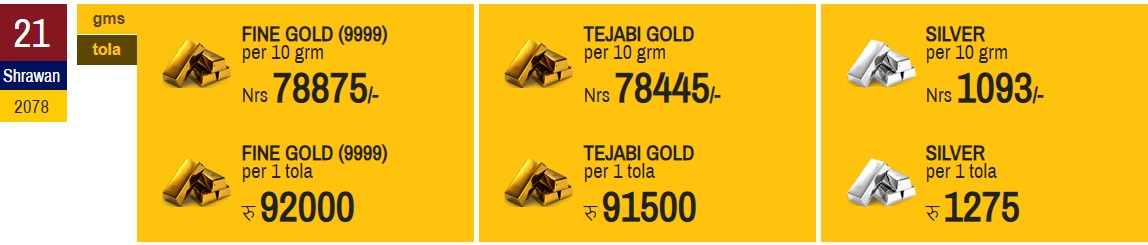 त्यसैगरी, तेजावी सुनको मूल्य पनि आज स्थिर नै रहेको छ । हिजो तोलामा ९१ हजार ५ सय रुपैयाँमा कारोबार भएको तेजाबी सुन आज पनि सोही मुल्यमा कारोबार भएको छ ।