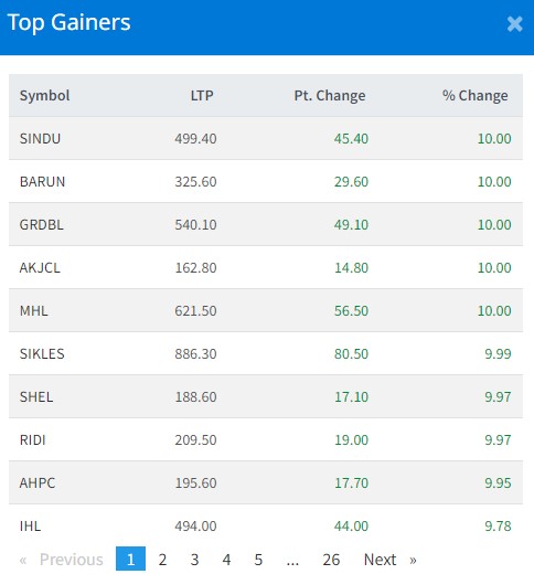 आज सबैभन्दा धेरै सिन्धु विकास बैंक बरुण हाइड्रो, ग्रिन डेभलपमेन्ट बैंक, आँखुखोला जलविद्युत र मन्दकिनी हाइड्रोका लगानीकर्ताले कमाएका छन् । आज यी कम्पनीका लगानीकर्ताले १० प्रतिशतका दरले कमाएका हुन् । आज ११ कम्पनीको शेयर मूल्यमा सकारात्मक सर्किट लागेको छ ।