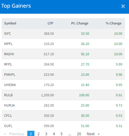 आज सबैभन्दा धेरै श्री इन्भेष्टमेन्ट फाइनान्स, मल्टिपर्पोज फाइनान्स कम्पनी, राद्यी विद्युत कम्पनीका लगानीकर्ताले कमाएका छन् । यी कम्पनीका लगानीकर्ताले १० प्रतिशतका दरले कमाएका छन् । रिभर फल्स पावर कम्पनीका लगानीकर्ताले ९ दशमलव ९९ प्रतिशतका दरले कमाएका छन् । पञ्चकन्यामाई हाइड्रोपावर कम्पनीका लगानीकर्ताले ९ दशमलव ९६ प्रतिशतका दरले कमाएका छन् ।
