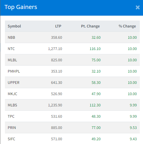 आज ६ वटा कम्पनीका लगानीकर्ताले १० प्रतिशतका दरले कमाएका छन् । नेपाल बङलादेश बैंक, नेपाल टेलिकम, महालक्ष्मी विकास बैंक, पञ्चकन्यामाइृ हाइड्रोपावर, अपर तामाकोशी, मैलुङ खोला जलविद्युत कम्पनीका लगानीकर्ताले १० प्रतिशतका दरले कमाएका हुन् । आज मानुषि लघुवित्तका लगानीकर्ताले ९ दशमलव ९९ प्रतिशतका दरले कमाएका हुन् ।