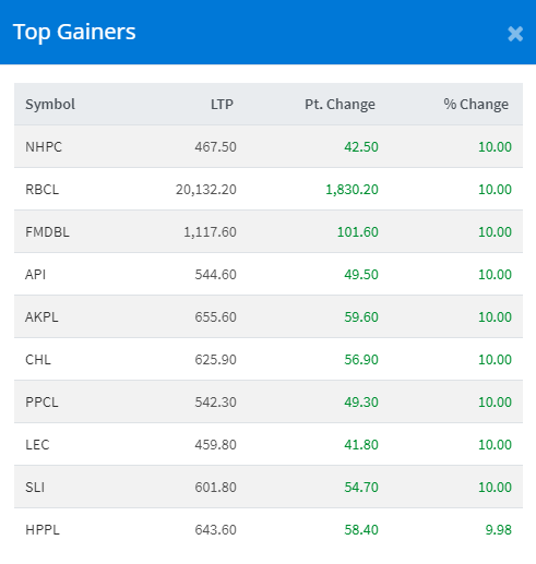 आज १४ वटा कम्पनीको शेयर मुल्यमा सकारात्मक सर्किट लागेको छ । नेशनल हाइड्रोपावर कम्पनीको शेयर मुल्य १० प्रतिशतले बढेको छ । राष्ट्रिय बीमा कम्पनीको शेयर मुल्य १० प्रतिशतले बढेको छ । फर्स्ट माइक्रोफाइनान्स कम्पनीको पनि १० प्रतिशतले नै शेयर मुल्य बढेको छ ।