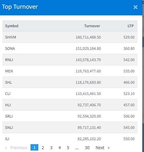 आज ४ अर्ब ३० करोडमाथिको शेयर कारोबार हुँदा सबैभन्दा धेरै शिवम् सिमेन्टको शेयर कारोबार भएको छ । आज यस कम्पनीको १८ करोड ७ लाख रुपैयाँको शेयर कारोबार भएको छ । सोनापुर मिनरल्सको १५ करोड १० लाख रुपैयाँको शेयर कारोबार भएको छ । रिलायबल नेपाल लाइफको १४ करोड ३५ लाख रुपैयाँको शेयर कारोबार भएको छ ।