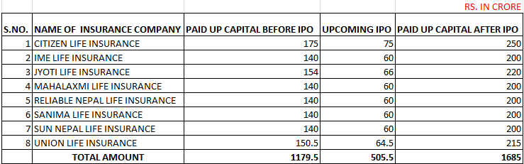 आईपिओ जारी भएपछि सानिमा लाइफ इन्स्योरेन्स कम्पनी, रिलायवल नेपाल लाइफ इन्स्योरेन्स कम्पनी, आईएमई लाइफ इन्स्योरेन्स कम्पनी ,महालक्ष्मी लाइफ इन्स्योरेन्स कम्पनी र सन नेपाल लाइफ इन्स्योरेन्स कम्पनीको चुक्ता पूँजी २ अर्ब पुग्नेछ । त्यसैगरी सिटिजन लाईफ इन्स्योरेन्स कम्पनीको २ अर्ब ५० करोड, ज्योति लाईफ इन्स्योरेन्स कम्पनीको २ अर्ब २० करोड रुपैयाँ, युनियन लाईफ इन्स्योरेन्स कम्पनीको २ अर्ब १५ करोड रुपैयाँ चुक्ता पूँजी पुग्नेछ ।