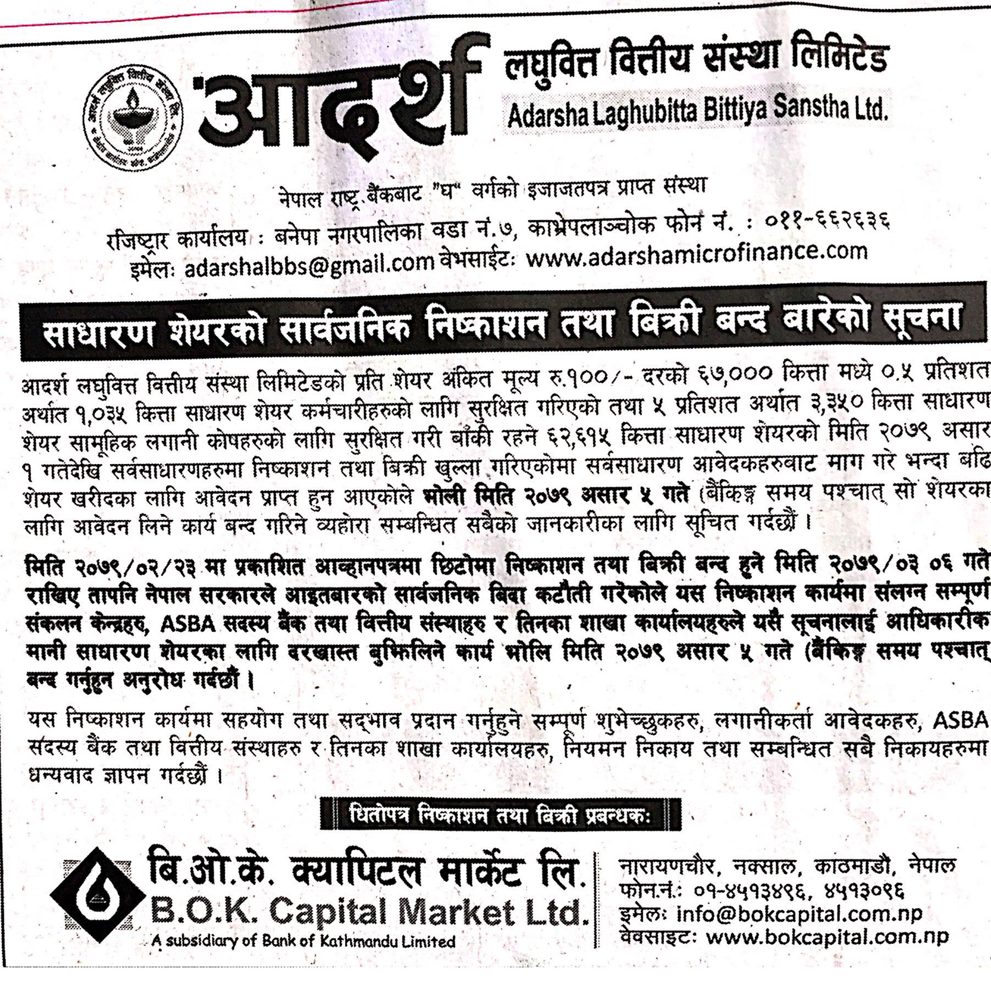 काठमाडौं । आदर्श लघुवित्त वित्तीय संस्था लिमिटेडले सर्वसाधारणमा निष्काशन गरेको आइपीओमा आवेदन दिने आज अन्तिम दिन रहेको छ । लघुवित्तले असार १ गतेदेखि प्रतिकित्ता १०० रुपैयाँ अंकित मूल्यमा ६७ लाख रुपैयाँ बराबरको ६७ हजार कित्ता आइपीओ निष्काशन गरेको थियो ।