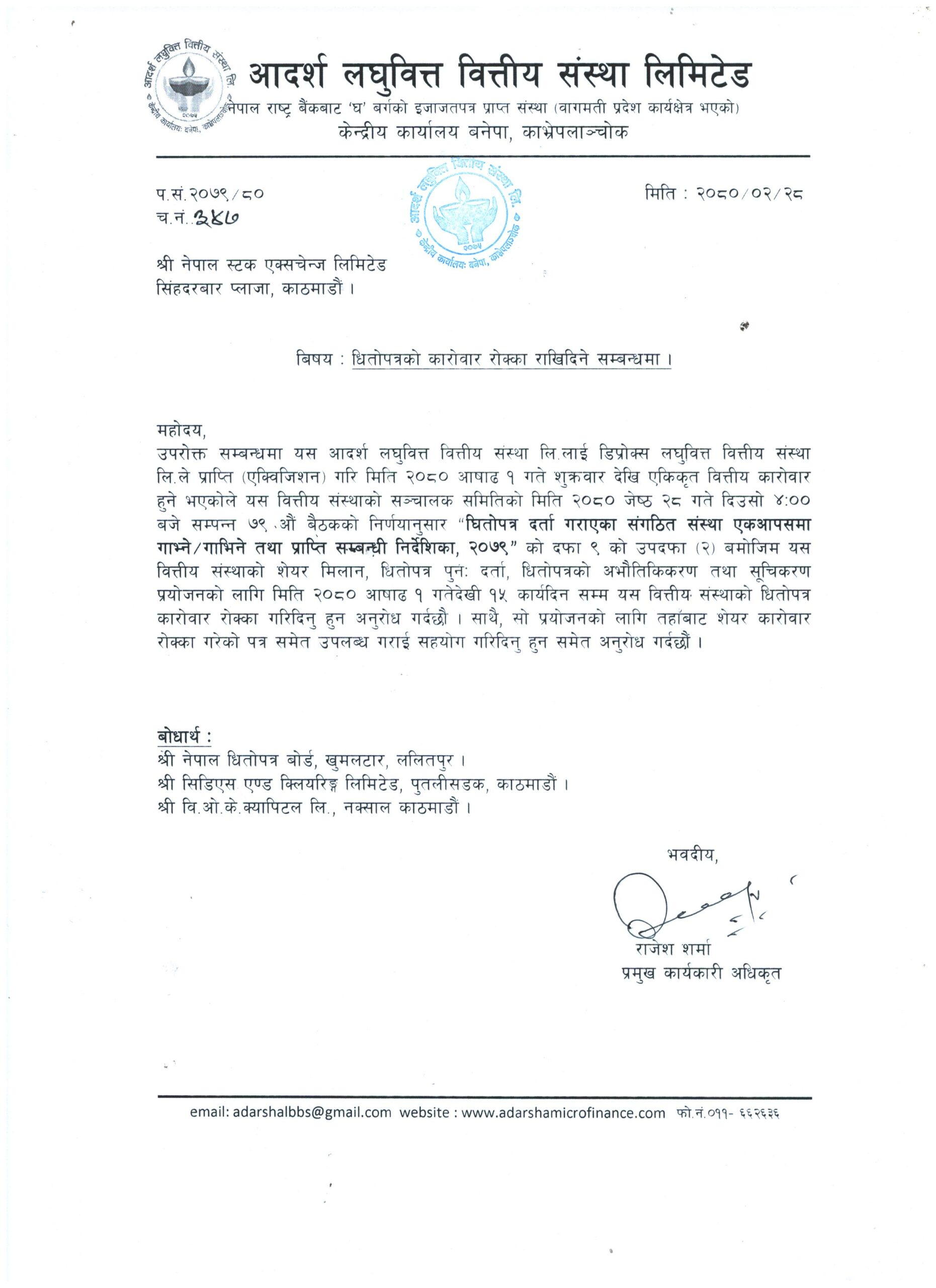 आदर्श लघुवित्तको शेयर कारोबार रोक्का
