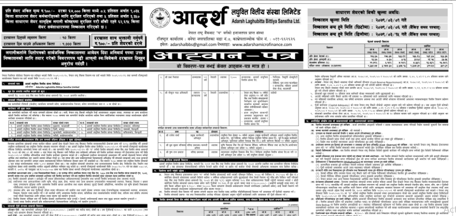 काठमाडौं । आदर्श लघुवित्त वित्तीय संस्था लिमिटेडले असार १ गतेदेखि सर्वसाधारणमा आइपीओ निष्काशन तथा विक्री गर्ने भएको छ । कम्पनीले ६७ लाख बराबरको ६७ हजार कित्ता आइपीओ सर्वसाधारणमा जारी गर्न लागेको हो ।