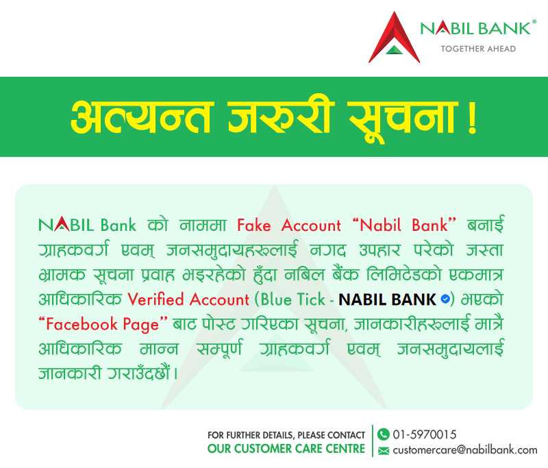 नबिल बैंकको नाममा नक्कली एकाउन्ट बनाएर भ्रामक सूचना सम्प्रेषण भएको भन्दै सूचनामार्फत आम ग्राहक र जनसमुदायलाई सचेत गराएको हो । फेक अकाउन्टबाट नगद उपहार परेको जस्ता भ्रामक सूचना प्रवाह भएको पाइएको भन्दै बैंकले भ्रममा नपर्न आग्रह गरेको हो ।