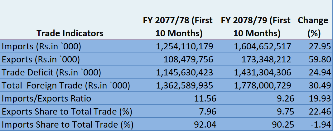 बैशाख महिनासम्ममा नेपालले १६ खर्ब ४ अर्ब रुपैयाँको बस्तु तथा सामान आयात गरेको छ । जवकी यहि अवधिमा नेपालबाट जम्मा एक खर्ब ७३ अर्ब रुपैयाँको मात्रै निर्यात भएको छ । गत वर्षको यहि अवधिको तुलनामा व्यापार घाटा २४ प्रतिशत बढि हो ।