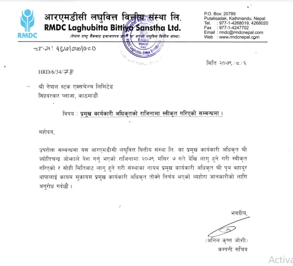 काठमाडौं । आरएमडिसी लघुवित्त वित्तीय संस्थाका प्रमुख कार्यकारी अधिकृतको राजिनामा स्वीकृत भएको छ । कम्पनीका प्रमुख कार्यकारी अधिकृत ज्योतिचन्द्र ओझाको राजीनामा स्वीकृत भएको हो । उनले पेश गरेको निवेदन कम्पनीले मंसिर ७ गतेदेखि लागू हुनेगरी स्वीकृत गराएको छ ।