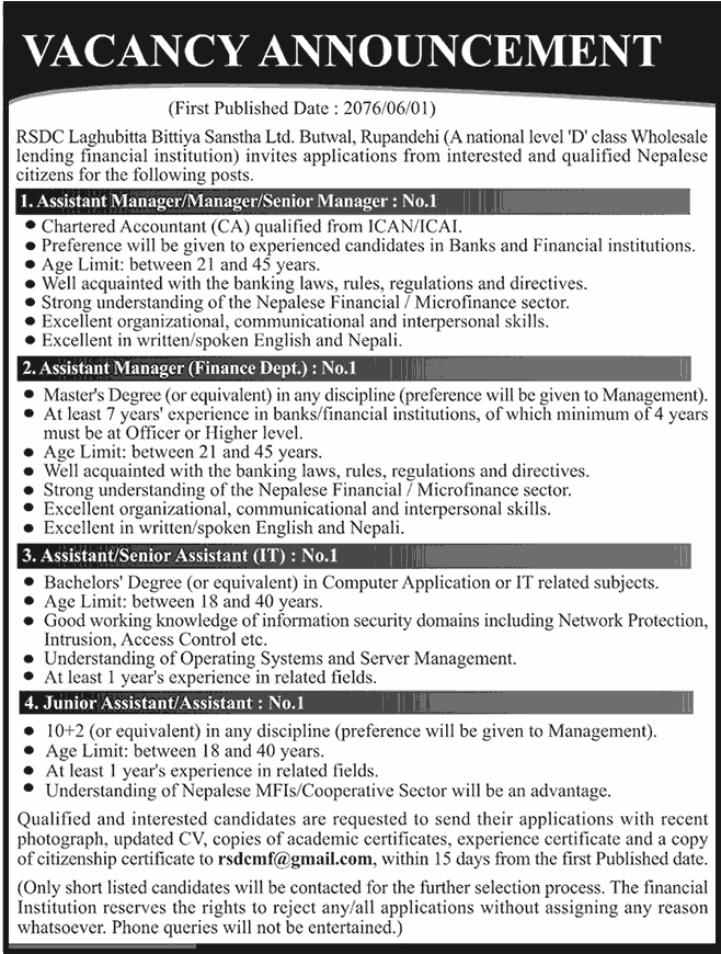 काठमाडौँ । आरएसडिसी लघुवित्त वित्तीय संस्थाले विभिन्न चार पदका लागि कर्मचारी माग गरेको छ । संस्थाले एसिस्टेन्ट म्यानेजर/म्यानेजर/सिनियर म्यानेजर, एसिस्टेन्ट म्यानेजर( फाइनान्स डिपार्ट), एसिस्टेन्ट/सिनियर एसिस्टेन्ट, जुनियर एसिस्टेन्ट पदका लागि कर्मचारी माग गरेको हो ।