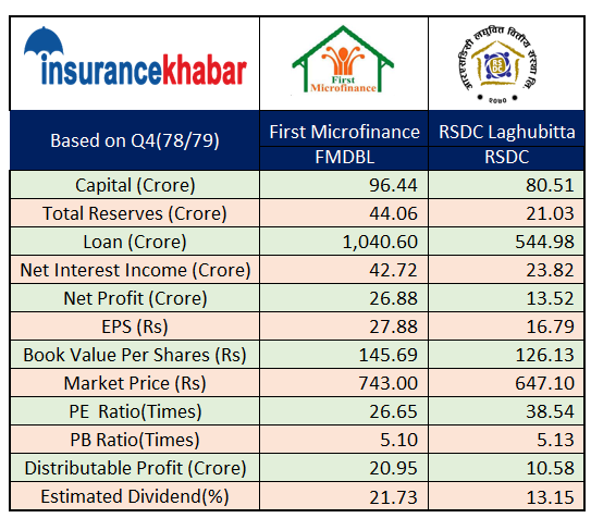 फर्स्ट माइक्रोफाइनान्सको चुक्ता पूँजी ९६ करोड ४४ लाख रहेको छ भने आरएसडिसी लघुवित्तको चुक्ता पुँजी ८० करोड ५१ लाख रहेको छ ।