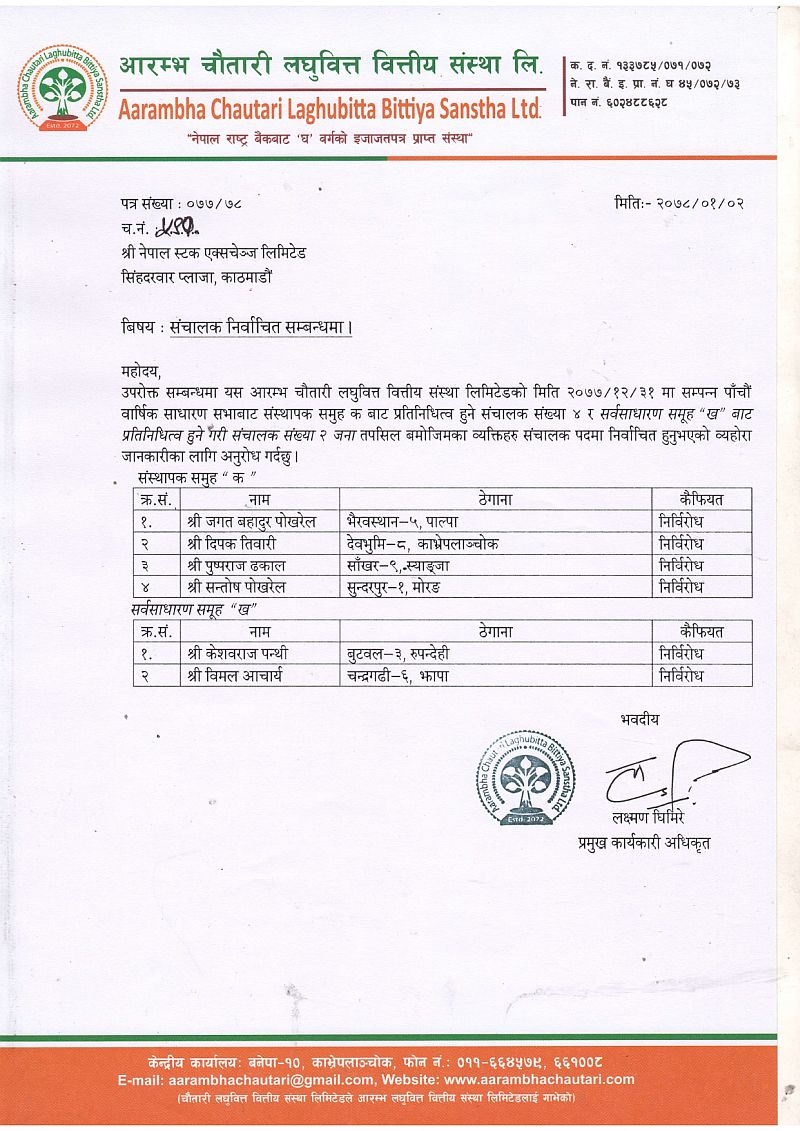 काठमाडौं । आरम्भ चौतारी लघुवित्त वित्तीय संस्था लिमिटेडमा ६ जना सञ्चालक निर्वाचित भएका छन् । कम्पनीको चैत ३१ गते सम्पन्न वार्षिक साधारण सभाबाट ६ जना सञ्चालक निर्वाचित भएका हुन् ।