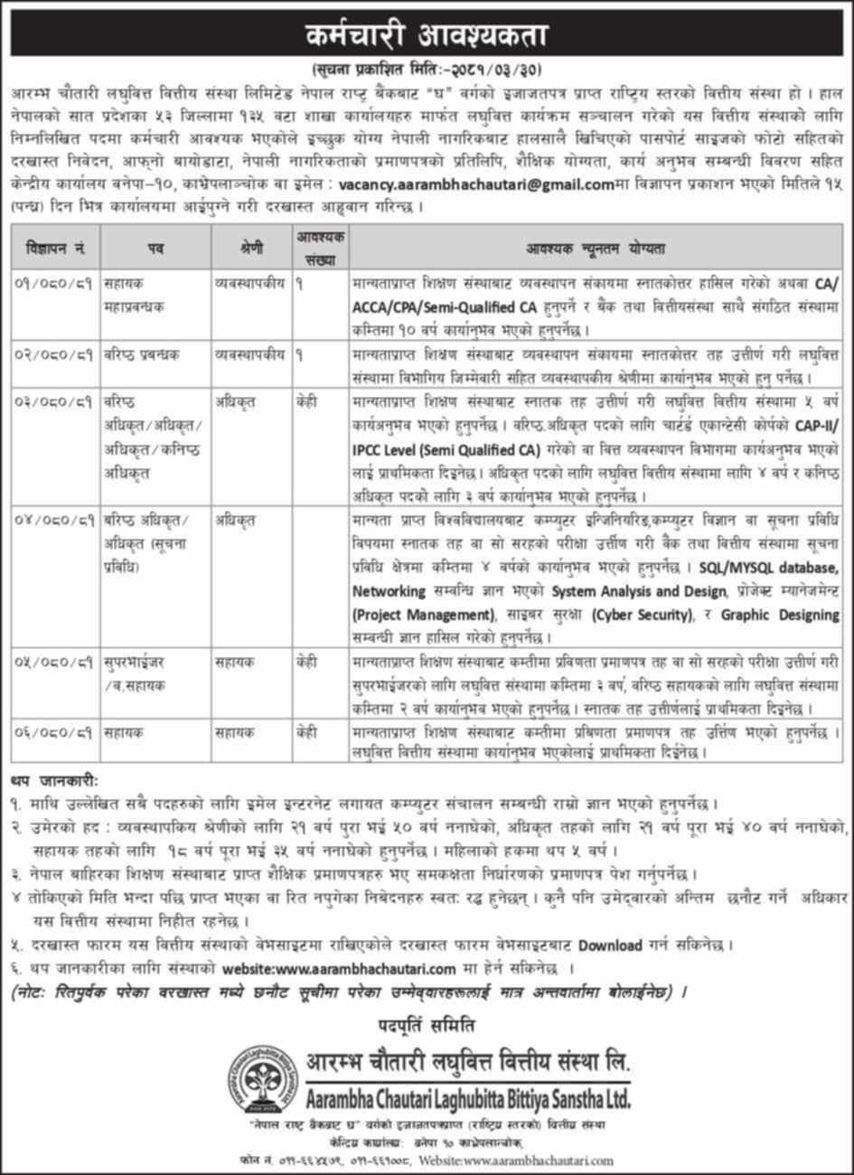 आरम्भ चौतारी लघुवित्तले माग्यो धेरै पदका लागि कर्मचारी