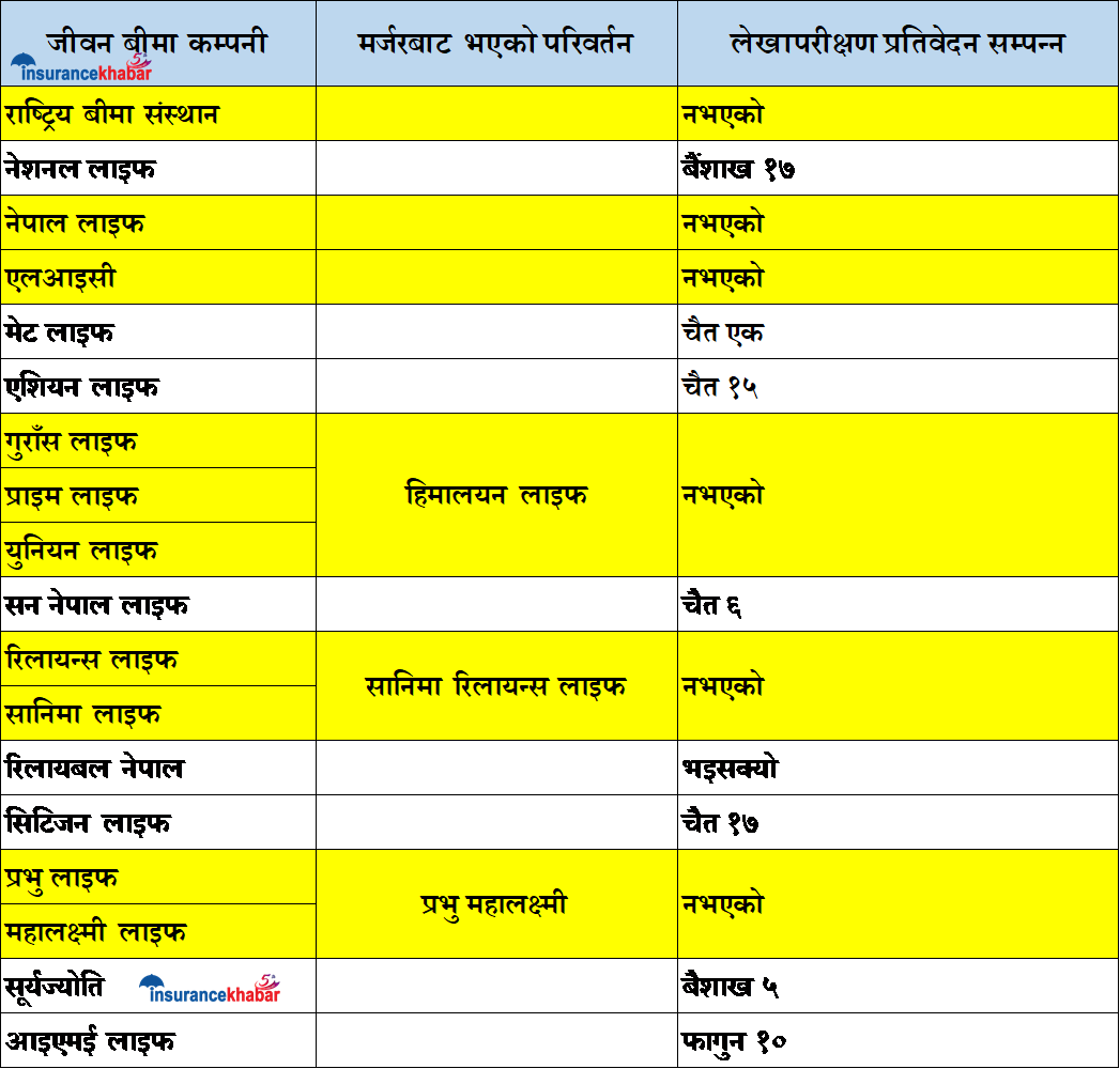 लेखापरीक्षण हुन बाँकी साविक गुराँस, यूनियन र प्राइम मर्जर भएर हिमालयन लाइफ बनेको छ । मर्जर भए पनि लेखापरीक्षण भने गर्नु पर्छ । त्यस्तै साविक सानिमा र रिलायन्स मर्जर भएर सानिमा रिलायन्स बनेको छ । यहि असार २७ गते एकिकृत कारोबार शुभारम्भ गर्न थालेका महालक्ष्मी र प्रभुले पनि गत वर्षको लेखापरीक्षण सम्पन्न गर्न सकेका छैनन् ।