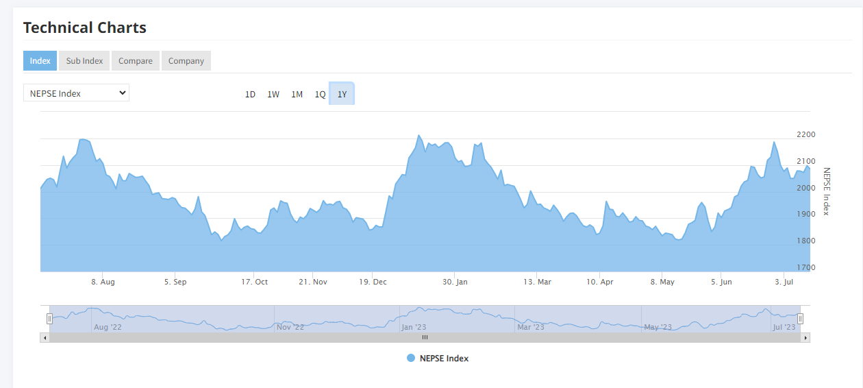 चालु आर्थिक वर्षको पहिलो चरणमा भदौ, असोज र कार्तिक महिना बजार सबैभन्दा तल्लो विन्दुमा रह्यो । यस अवधिमा नेप्से सूचक १८१५ अंकसम्म झर्यो । चुनावको दौरानमा मंसिर, पुस र माघ महिनामा बजारले गति लियो । छोटो समयमै शेयर बजारमा ३९६ अंकको सुधार देखियो । यस सँगै शेयर बजारमा रौनक भित्रिएको थियो । विगत साढे दुई वर्षदेखि सुस्ताएको शेयर बजार चुनावको समयमा अनपेक्षित रुपमा बढ्यो ।