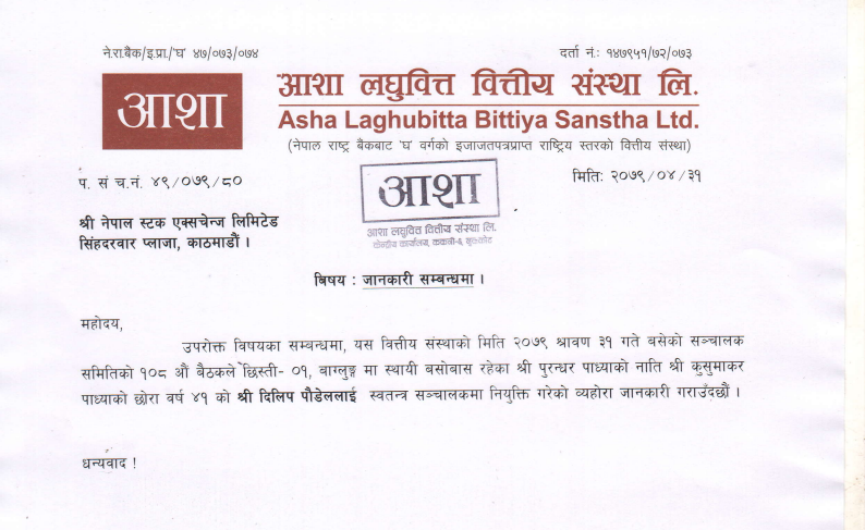 काठमाडौं । आशा लघुवित्त वित्तीय संस्थाको स्वतन्त्र सञ्चालकमा दिलीप पौडेल नियुक्त भएका छन् । कम्पनीको गत मंगलवार अर्थात साउन ३१ गते बसेको सञ्चालक समिति बैठकले स्वतन्त्र सञ्चालकमा पौडेललाई नियुक्त गरेको हो ।