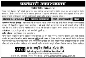 नेपाल राष्ट्र बैंक बाट घ वर्गको इजाजत प्राप्त राष्ट्रिय स्तरको लघुवित्त संस्था आशा लघुवित्तले केन्द्रिय कार्यालयका लागि कर्मचारी माग गरेको छ । लघुवित्तले सहायक महाप्रबन्धक पदका लागि कर्मचारीको माग गरेको हो ।