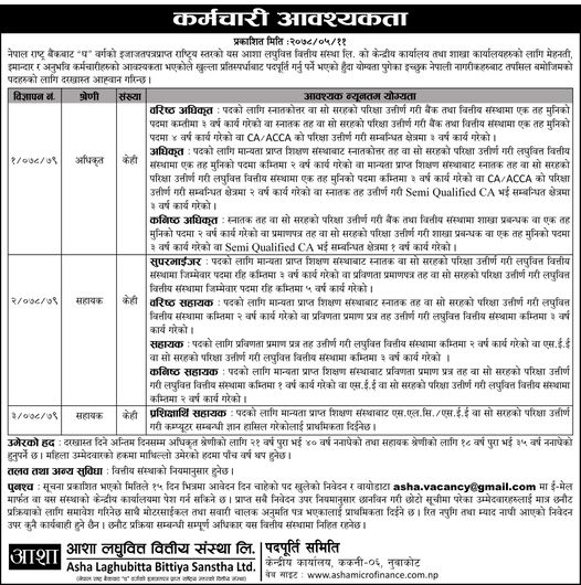 संस्थाले आफ्नो भइरहेको विभिन्न शाखा कार्यालय तथा अब खोलिने नयाँ शाखा कार्यालयका लागि कर्मचारीको माग गरेको हो । ईच्छुक तथा योग्यता पुगेकाले विज्ञापन प्रकाशित भएको मितिले १५ दिनभित्र आवेदन दिइसक्नुपर्नेछ ।