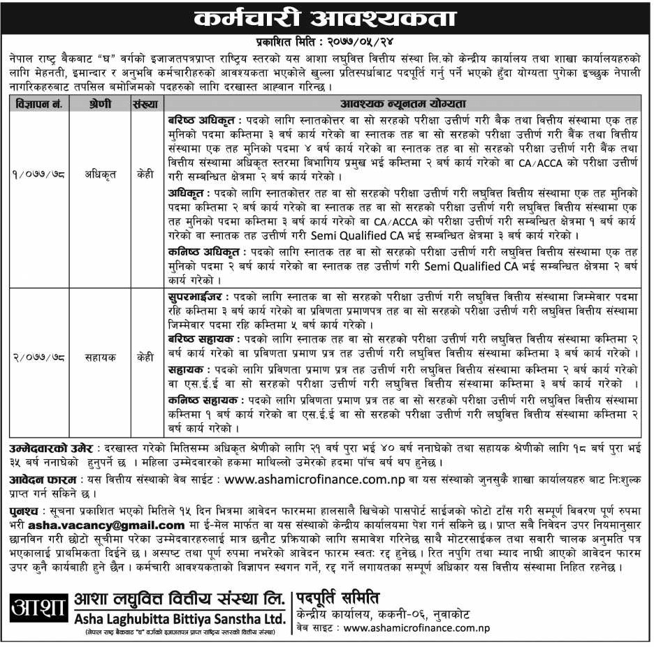 काठमाडौँ । आशा लघुवित्त वित्तीय संस्थाले विभिन्न पदका लागि कर्मचारी माग गरेको छ । संस्थाले अधिकृततर्फ वरिष्ठ अधिकृत, अधिकृत र कनिष्ठ अधिकुत र सहायक तर्फ सुपरभाइजर, वरिष्ठ सहायक, सहायक र कनिष्ठ सहायक माग गरेको जनाएको छ ।