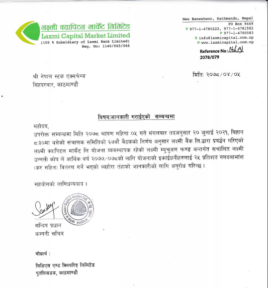 कोषले आर्थिक वर्ष २०७७/७८ को लागि आफ्ना इकाईधनीलाई २५ प्रतिशत नगद लाभांश वितरण गर्ने प्रस्ताव गरेको हो ।