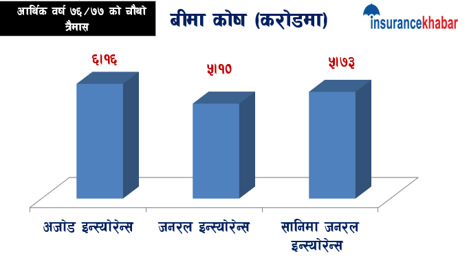 बीमा कोषमा अजोड इन्स्योरेन्स अघि छ । अजोड इन्स्योरेन्सको बीमा कोषमा ६ करोड १६ लाख छ भने जनरल इन्स्योरेन्सको बीमा कोषमा ५ करोड १० लाख छ त्यस्तै सानिमा जनरल इन्स्योरेन्सको बीमा कोषमा ५ करोड ७३ लाख रुपैयाँ संचित छ ।