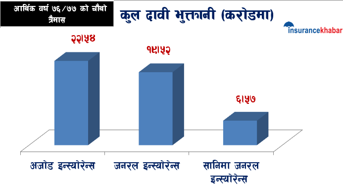 अजोड इन्स्योरेन्सले आर्थिक वर्ष ७६/७७मा २२ करोड ५४ लाख कुल दावी भुक्तानी गरेको छ भने जनरल इन्स्योरेन्सले १९ करोड ५२ लाख र सानिमा जनरल इन्स्योरेन्सले ६ करोड ५७ लाख कुल दावी भुक्तानी गरेको छ ।