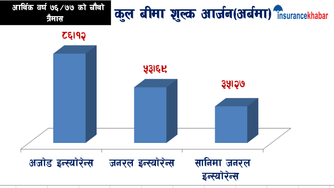 चालु आर्थिक वर्षको चौथो त्रैमाससम्म अजोड इन्स्योरेन्सले ८६ करोड १२ लाख कुल बीमा शुल्क आर्जन गरको छ भने जनरल इन्स्योरेन्सले ५३ करोड ६९ लाख कुल बीमा शुल्क आर्जन गरेको छ । सानिमा जनरल इन्स्योरेन्सले ३५ करोड २७ लाख कुल बीमा शुल्क आर्जन गरको छ ।