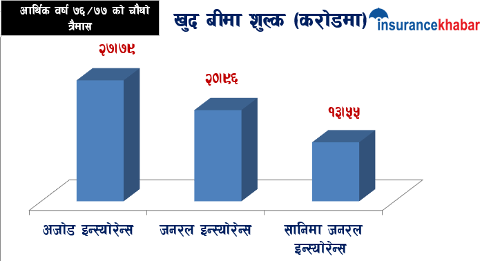 खुद बीमा शुल्क आर्जनमा अजोड इन्स्योरेन्स अघि छ । अजोड इन्स्योरेन्सले २७ करोड ७९ लाख खुद बीमा शुल्क आर्जन गरेको छ भने जनरल इन्स्योरेन्सले २० करोड ९६ लाख खुद बीमा शुल्क आर्जन गरको छ र सानिमा जनरल इन्स्योरेन्सले १३ करोड ५५ लाख खुद बीमा शुल्क आर्जन गरको छ ।