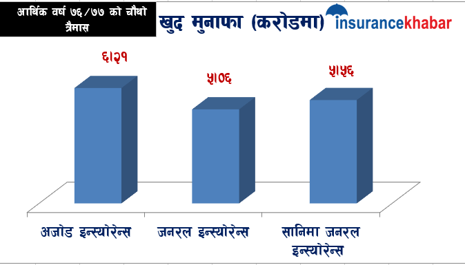 खुद नाफाको आधारमा अजोड इन्स्योरेन्स अघि छ । यो १२ महिनाको अवधिमा अजोड इन्स्योरेन्सले ६ करोड २१ लाख खुद नाफा गरेको छ भने सानिमा जनरल इन्स्योरेन्सले ५ करोड ५६ लाख खुद नाफा गरेको छ र जनरल इन्स्योरेन्सले ५ करोड ०६ लाख खुद नाफा गरेको छ ।