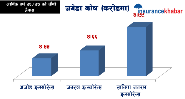 जगेडा कोषमा सानिमा जनरल इन्स्योरेन्स अघि छ । सानिमा जनरल इन्स्योरेन्सको जगेडा कोषमा ४ करोड ९९ लाख संचित छ भने जनरल इन्स्योरेन्सको जगेडामा ४ करोड ६६ लाख रुपैँया छ भने अजोड इन्स्योरेन्सको जगेडा कोषमा ४ करोड ५५ लाख रुपैँया संचित छ ।