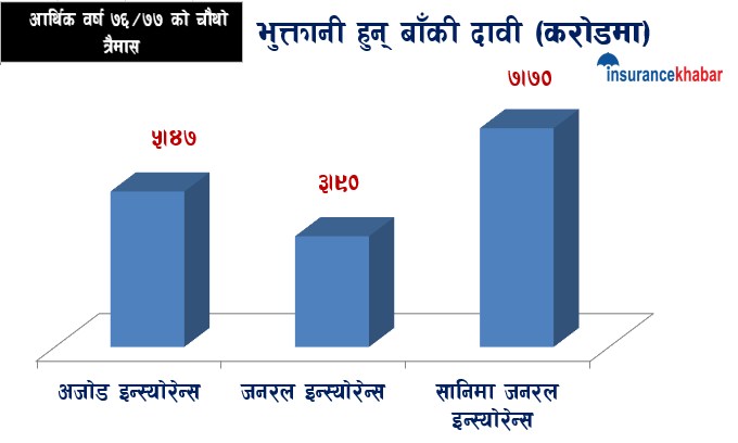 सानिमा जनरल इन्स्योरेन्सले ७ करोड ७० लाख दावी भुक्तानी गर्न बाँकी रहेको छ भने अजोड इन्स्योरेन्सले ५ करोड ४७ लाख र जनरल इन्स्योरेन्सले ३ कारोड ९० लाख दावी भुक्तानी गर्न बाँकी छ ।