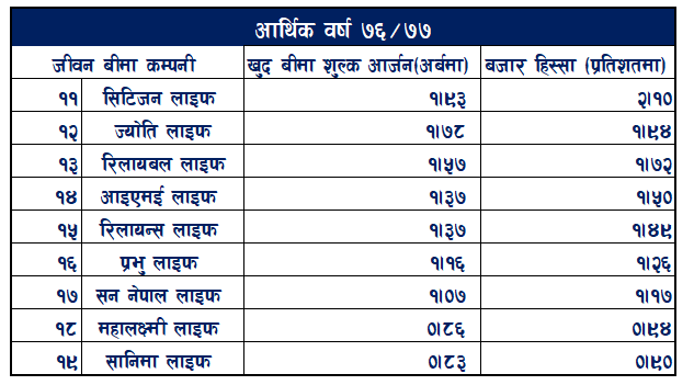 १९ जीवन बीमा कम्पनी मध्य नेपाल लाईफ इन्स्योरेन्सले सर्वाधिक २७ अर्ब ३४ करोड खुद बीमा शुल्क आर्जन गर्न सफल भएको छ । नेपाल लाईफले आर्थिक वर्ष ७६/७७ मा सम्पूर्ण जीवन बीमा कम्पनीहरुले गरेको खुद बीमा शुल्क आर्जनको २९ दशमलव ८३ प्रतिशत हिस्सा लिन सफल भएको छ।