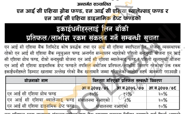 क्यापिटलले एनआईसी एशिया ग्रोथ फण्ड, एनआईसी एशिया ब्यालेन्स्ड् फण्ड र एनआईसी एशिया डाइनामिक डेप्ट फण्डको लाभांश इकाईधनीहरुको खातामा पठाएको हो । क्यापिटलले डिम्याट खातामा उल्लेख गरेको बैंक खातामा उक्त लाभांश जम्मा गरेको जनाएको छ ।