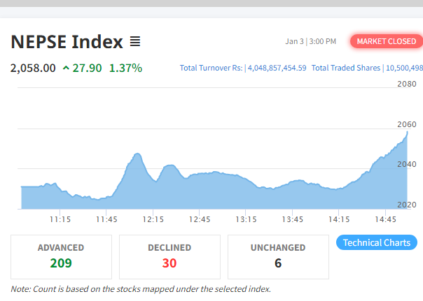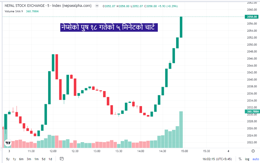 बजार २ बजेर १५ मिनेटसम्म स्थीरजस्तै थियो। त्यसपछि भने बजार आक्रामक हिसाबले वृद्धि हुँदै २०५८ विन्दुमा बन्द भएको छ। अन्तिम ४५ मिनेटमा बजार २०३० को विन्दुबाट २०५८ विन्दुसम्म पुगेर बन्द भएको हो।