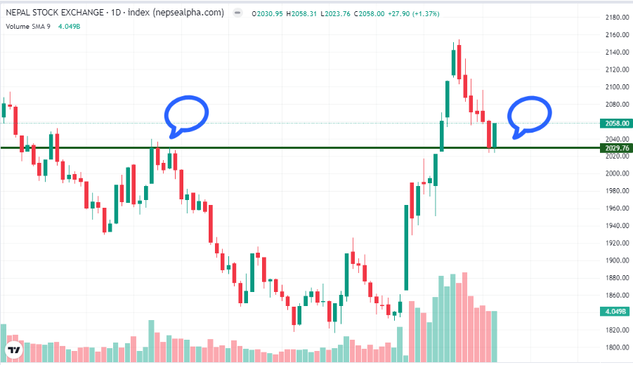 बजार केही समयअघि सेप्टेम्बरको अन्तिम साता बजार २०३० को विन्दुलाई तोडेर माथि जान सकेको थिएन। केही दिन त्यही क्षेत्रमा बसेर बजार फर्किएको थियो। आज बजार त्यही क्षेत्रबाट माथि बढेको हो।